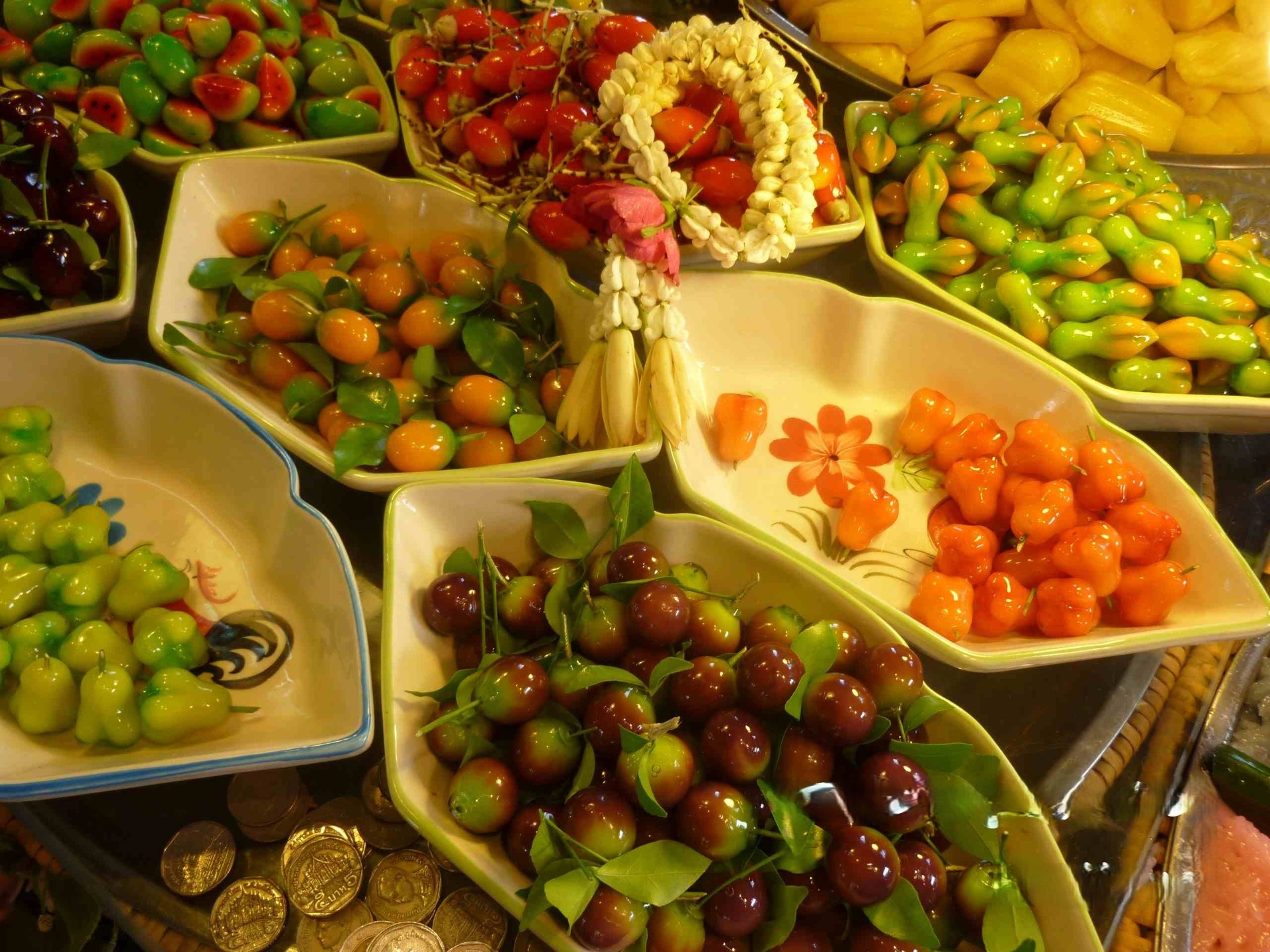 Na mojí fotce thajských mini cukrovinek look choop modelovaných z mungo fazolové pasty vidíte vpravo malinké oranžové a vlevo zelené sladkosti v typickém zvonkovitém tvaru jablíčka lásky.