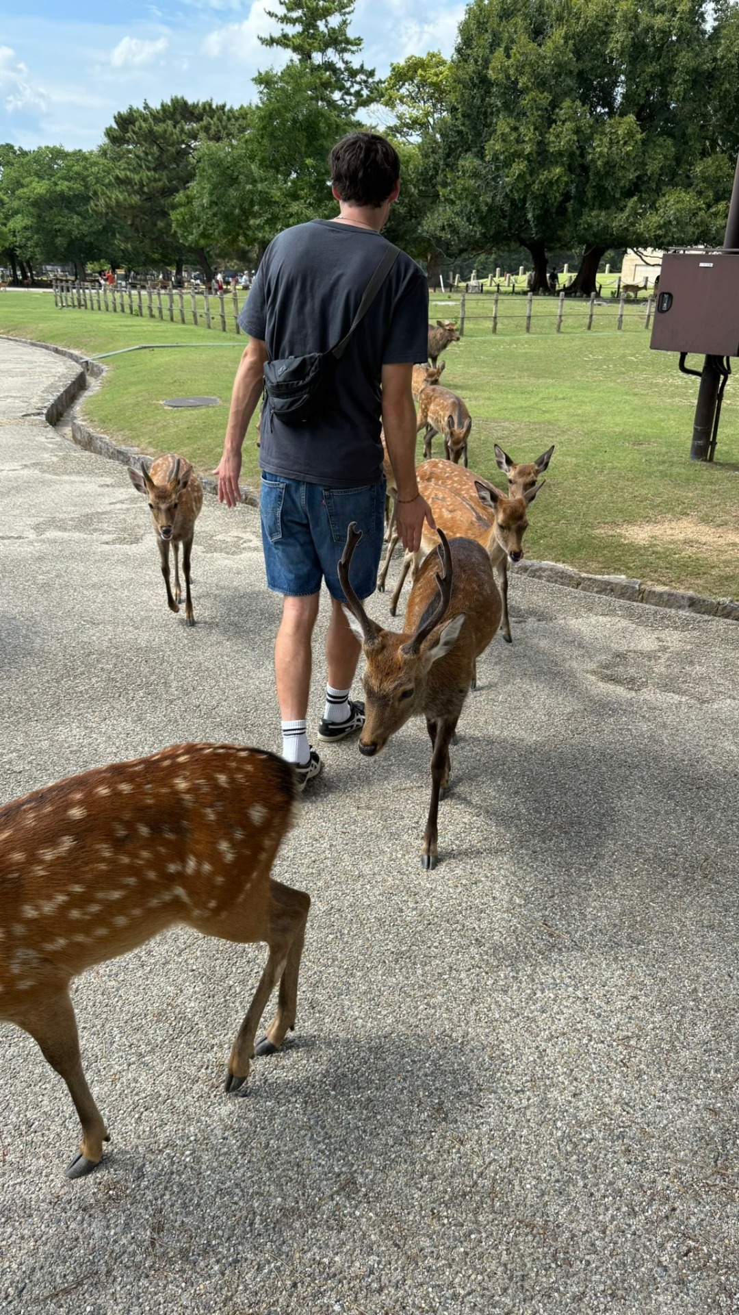 Co se týče krmení, můžete je nakrmit sušenkami připravovanými speciálně jen pro ně z pšeničné mouky a rýžových otrub bez cukru, vlastně se jedná o takové jelení suchary. Sušenky koupíte u stánků v parku, cena za dávku krmiva se obvykle pohybuje kolem 150 円 (japonských jenů). Jde o registrovanou ochrannou známku Nadace pro ochranu jelenů v Nara a část zisku jde na projekty spojené s ochranou jelenů. Jelínci jsou ochočení a vůbec se nebojí sami přicházet přímo k lidem a loudit o dobroty, takže je to jedinečná příležitost pro interakci s těmito krásnými zvířaty!