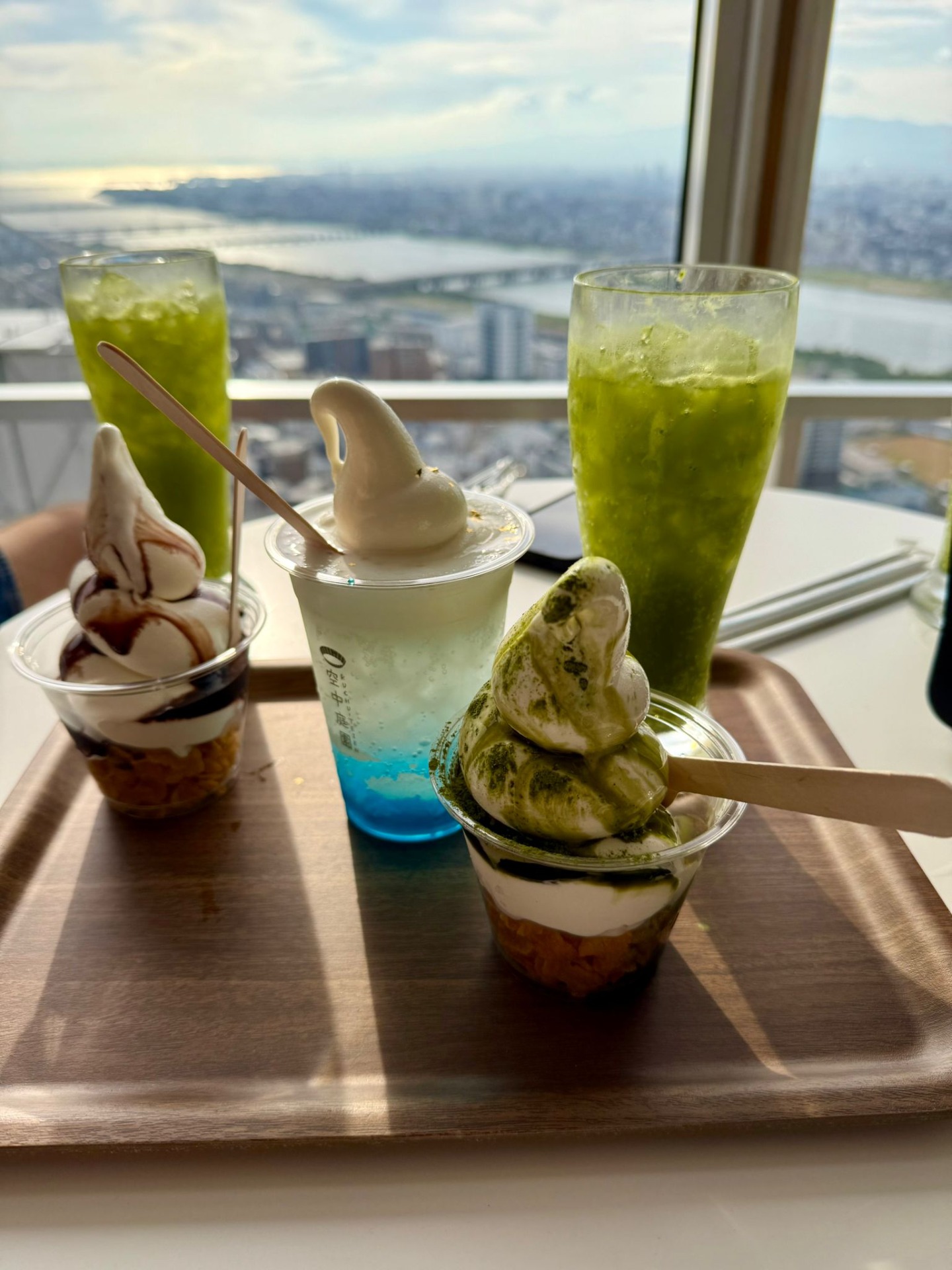 Na fotce vidíte, jak se oba světy krásně setkávají. Dva poháry parfaitů s kukuřičnými lupínky na dně, vrstvou smetany a soft servem na vrcholu. Jeden ozdobený sirupem, druhý posypaný matchou. Vedle nich modrá soda se zmrzlinou a vysoké sklenice zeleného čaje, a k tomu úžasný panoramatický výhled na japonské město a hory v dálce.