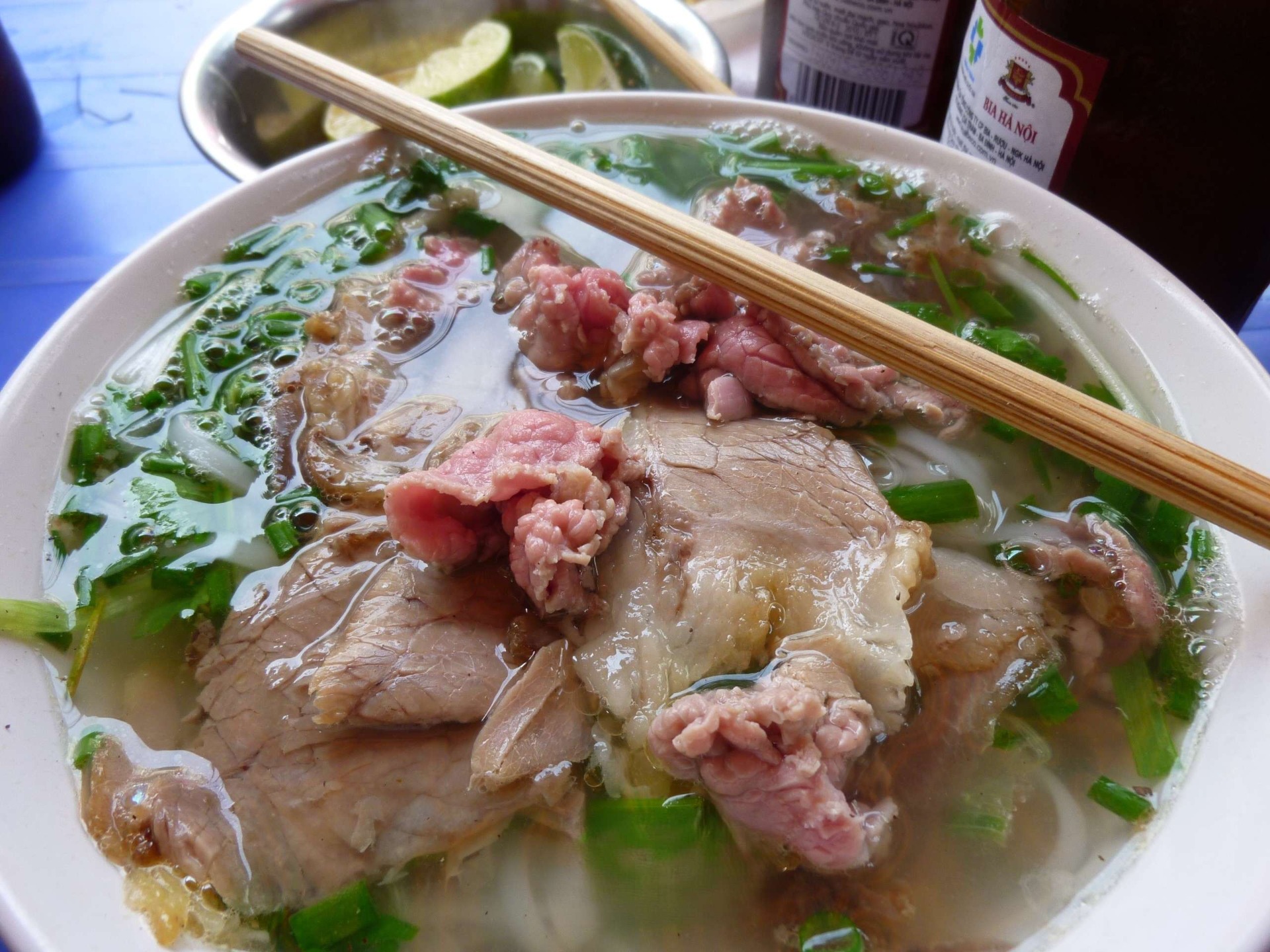 Byla obrovská a voňavá! Vývar, čirý, přitom tak silný, že se okamžitě sbíhaly sliny. Na hladině se třpytily kapky tuku, mezi nudlemi se ukrývaly tenké plátky hovězího, část ještě syrová, růžová, tak je to má u téhle polévky být, čekající, až je vývar dokonale dovaří. Navrch hrst zelené cibulky a koriandru. Vedle misky mraky přísad bez omezení, čerstvé chilli, limetka a rybí omáčka… všechno jako by člověka navádělo... tak už ochutnej. Záměrně tady pomíjím konkrétní cenu, protože byla za něco tak dobrého a za tolik času věnovaného poctivému vaření, opravdu hanebně nízká.