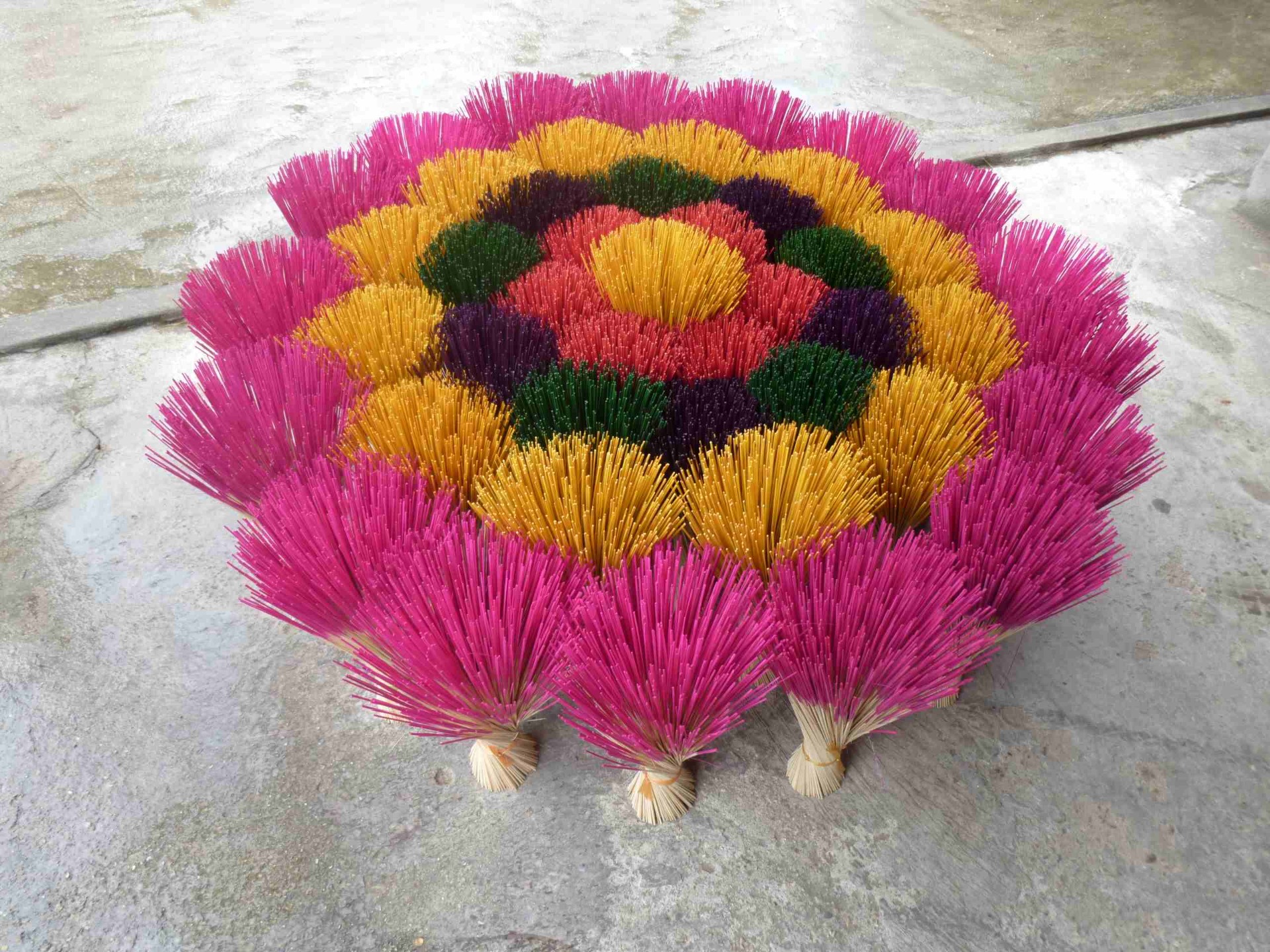 Barevné kytice tyčinek v závěrečné fázi je třeba nechat proschnout. Desítky svazků proto bývají rozloženy po celé vesnici na zem těsně vedle sebe. Pohled na takovou barevnou scenérii je opravdu nádherný!